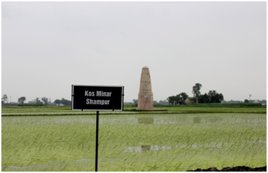 This Kos Minar is located at Shampur, tehsil Nurmahal, District Jalandhar . In 1619 CE, emperor Jahangir ordered Baqir Khan, the Fauzdar of Multan, to erect a kos-minar (mile-stone) at every kos (3.20 km) on the old imperial route. Kos -minars are brick structures standing on square platform covered with plaster. Each minar soars from a tapering octagonal base which is separated from the upper circular portion by a moulding. During the Mughal time, the Kos Minars were important landmark of the imperial route and travel.