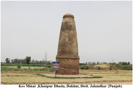 This Kos Minar is located at Khanpur Dhada,Dakhni, tehsil Nakodar, District Jalandhar . In 1619 CE, emperor Jahangir ordered Baqir Khan, the Fauzdar of Multan, to erect a kos-minar (mile-stone) at every kos (3.20 km) on the old imperial route. Kos -minars are brick structures standing on square platform covered with plaster. Each minar soars from a tapering octagonal base which is separated from the upper circular portion by a moulding. During the Mughal time, the Kos Minars were important landmark of the imperial route and travel.