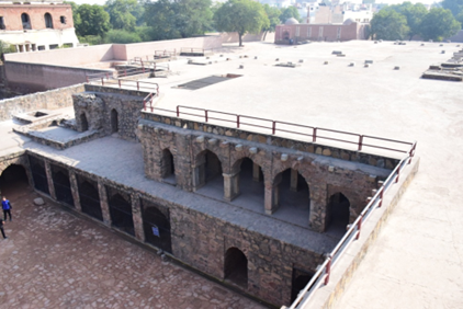 The edifice known as Firuz Shah's Palace and Tahkhana was built by Firuz Shah Tughluq, the Sultan of Delhi (CE 1351-1388). The palace was built of rubble masonry covered with thick lime plaster. Its arches are supported on sandstone carved pillars of Hindu temples. The palace-complex consists of an open courtyard on the sides of which are placed two to three-storeyed structures. In the massive western wall of the palace, is embedded a passage to which steps lead from the terrace. The passage meant for roofs guarding the palace, is provided with bastions, the hollow core of which has a pillared hall connected with other rooms and cells of the palace. The eastern side of the palace contains some structures in red sandstone which are of later origin. A lotus tank which is situated on the terrace is also a later addition.