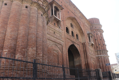 Gateways provided in the middle of the northern and southern walls are three-storeyed and made of lakhauri bricks, has central domed chambers on either end of which have arched openings. The inner side of the gateway is lower in height and is provided with projecting balconies. In the wings, flanking the central passage, are cells and staircases leading to the terrace. The exterior façade, exuding an imposing look, is decorated with panels on either side of the multifoil arched-openings with projecting balconies, resting on brackets at the first floor level. At the outer ends rounded towers having semi-circular and angular flutes are interspersed with gunslits.
