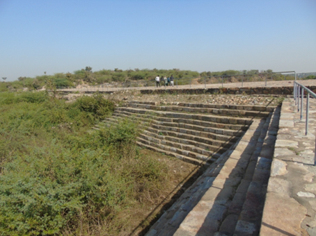 The construction of Anang Dam about 2 km south-west of Suraj Kund is ascribed to Anangpal of the Tomar dynasty of the eleventh century CE. It is battered on the east and has steps on the west with angular flanked steps at the southern and northern extremities. At the top, the dam is 19.8m while with the steps on the west and the batter (inclination) on the east it grows to over 27.43 m at the base. Its length is 101.2m. At the varying depths from the top of the bund, are seven drainage channels which run through the thickness of dam and could be used to keep water upto certain depth. The steps are made of ashlar blocks of stone but like the rubble core they are also laid in lime.