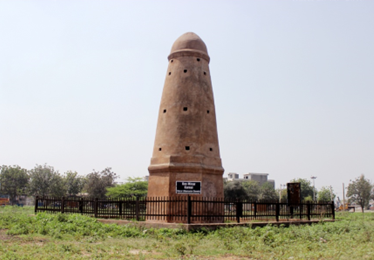 This Kos Minar is located near Namaste Chowk, Karnal, District Karnal. In 1619 CE, emperor Jahangir ordered Baqir Khan, the Fauzdar of Multan, to erect a kos-minar (mile-stone) at every kos (3.20 km) on the old imperial route. Kos-minars are brick structures standing on square platform covered with plaster. Each minar soars from a tapering octagonal base which is separated from the upper circular portion by a moulding. During the Mughal time, the Kos Minars were important landmark of the imperial route and travel.