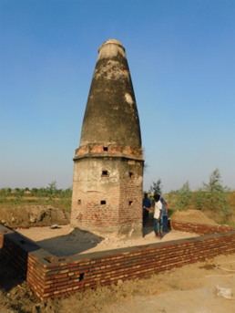 This Kos Minar is located at Kutail, District Karnal. In 1619 CE, emperor Jahangir ordered Baqir Khan, the Fauzdar of Multan, to erect a kos-minar (mile-stone) at every kos (3.20 km) on the old imperial route. Kos-minars are brick structures standing on square platform covered with plaster. Each minar soars from a tapering octagonal base which is separated from the upper circular portion by a moulding. During the Mughal time, the Kos Minars were important landmark of the imperial route and travel.