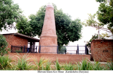 This Kos Minar is located at Bhiwani Khera, District Kurukshetra. In 1619 CE, emperor Jahangir ordered Baqir Khan, the Fauzdar of Multan, to erect a kos-minar (mile-stone) at every kos (3.20 km) on the old imperial route. Kos-minars are brick structures standing on square platform covered with plaster. Each minar soars from a tapering octagonal base which is separated from the upper circular portion by a moulding. During the Mughal time, the Kos Minars were important landmark of the imperial route and travel.