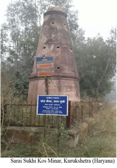 This Kos Minar is located at Sarai Sukhi, tehsil Kurukshetra, District Kurukshetra. In 1619 CE, emperor Jahangir ordered Baqir Khan, the Fauzdar of Multan, to erect a kos-minar (mile-stone) at every kos (3.20 km) on the old imperial route. Kos-minars are brick structures standing on square platform covered with plaster. Each minar soars from a tapering octagonal base which is separated from the upper circular portion by a moulding. During the Mughal time, the Kos Minars were important landmark of the imperial route and travel.