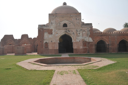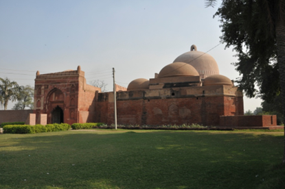 This mosque was built by Babur after the first Battle of Panipat to commemorate victory over Sultan Ibrahim Lodi in A.D. 1526.The mosque situated inside an enclosure having octagonal Towers at its corners, has its entrance on the north. The gateway built of bricks with red sand Stone facing, consists of a lintel bracket type opening encased in a huge arch, the spandrels of which are decorated with arched recesses encased in rectangular panels. The main prayer hall Square on plan has annexes on sides and its high façade divided in panels is plastered with lime. Each annexe has nine bays which are crowned with hemispherical domes sitting on low drums.