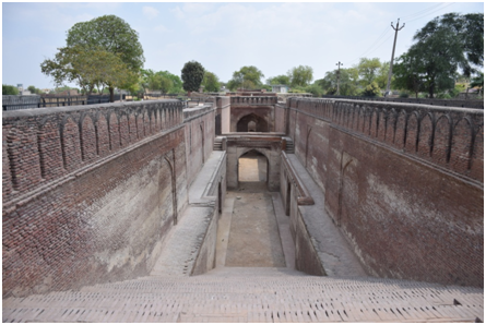 This baoli, the finest and the best preserved one in Haryana, according to an inscription on the wall, was built by Saidu Kala, a chobdar to emperor Shah jahan, in AH. 1069 (A.D. 1658-59). This baoli, an elaborate structure of brick and kankar block has one hundred one steps in three stages, separated by landings, leading to the water level. At the end of the flight of steps, is the circular well. The subsidiary staircases built within the thickness of the walls provide access to the landings.