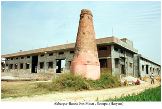 This Kos Minar is located at Akbarpur Barota, District Sonipat. In 1619 CE, emperor Jahangir ordered Baqir Khan, the Fauzdar of Multan, to erect a kos-minar (mile-stone) at every kos (3.20 km) on the old imperial route. Kos -minars are brick structures standing on square platform covered with plaster. Each minar soars from a tapering octagonal base which is separated from the upper circular portion by a moulding. During the Mughal time, the Kos Minars were important landmark of the imperial route and travel.