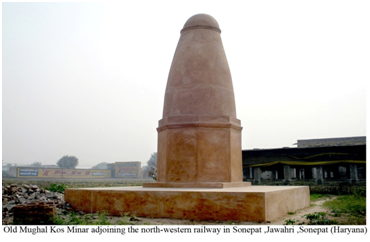 This Kos Minar is located at Jawahri, District Sonipat. In 1619 CE, emperor Jahangir ordered Baqir Khan, the Fauzdar of Multan, to erect a kos-minar (mile-stone) at every kos (3.20 km) on the old imperial route. Kos -minars are brick structures standing on square platform covered with plaster. Each minar soars from a tapering octagonal base which is separated from the upper circular portion by a moulding. During the Mughal time, the Kos Minars were important landmark of the imperial route and travel.