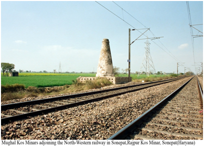 This Kos Minar is located at Rajpur, District Sonipat. In 1619 CE, emperor Jahangir ordered Baqir Khan, the Fauzdar of Multan, to erect a kos-minar (mile-stone) at every kos (3.20 km) on the old imperial route. Kos -minars are brick structures standing on square platform covered with plaster. Each minar soars from a tapering octagonal base which is separated from the upper circular portion by a moulding. During the Mughal time, the Kos Minars were important landmark of the imperial route and travel.
