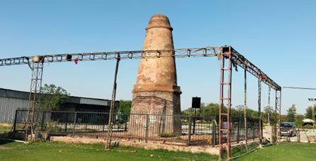 This Kos Minar is located at Gudhpuri in tehsil Hodal, District Palwal. In 1619 CE, emperor Jahangir ordered Baqir Khan, the Fauzdar of Multan, to erect a kos-minar (mile-stone) at every kos (3.20 km) on the old imperial route. Kos -minars are brick structures standing on square platform covered with plaster. Each minar soars from a tapering octagonal base which is separated from the upper circular portion by a moulding. During the Mughal time, the Kos Minars were important landmark of the imperial route and travel.