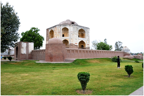 The tomb of Shamsher Khan stands on a raised plinth surrounded by a low wall having bastions at corners. This plinth is approachable through a gateway to the south, which still bears traces of painted decorationsin the interior. The tomb is an octagonal structure, with alternate sides measuring 8.3 m and 6.1m in length. It has two storeys of recesses with pointed arches. The structure is centrally crowned by low dome. The spandrels of the arches are filled with painted arabesque and geometrical designs. In addition to the above, the exterior had horizontal panels of decorative inscriptions, only traces of which are extant. According to the relevant inscription a reservoir, a mosque and a garden were completed during the reign of Akbar in AH 998 (AD 1590) by Shamsher Khan.