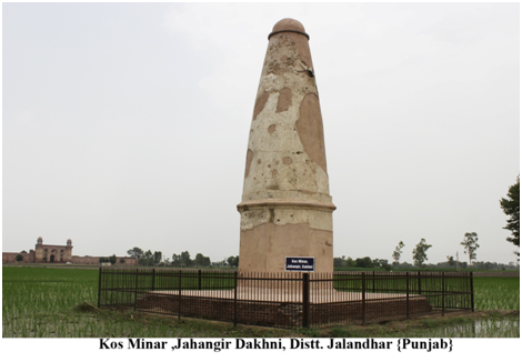 This Kos Minar is located at Dakhni Jahangir, tehsil Nakodar,District Jalandhar . In 1619 CE, emperor Jahangir ordered Baqir Khan, the Fauzdar of Multan, to erect a kos-minar (mile-stone) at every kos (3.20 km) on the old imperial route. Kos -minars are brick structures standing on square platform covered with plaster. Each minar soars from a tapering octagonal base which is separated from the upper circular portion by a moulding. During the Mughal time, the Kos Minars were important landmark of the imperial route and travel.