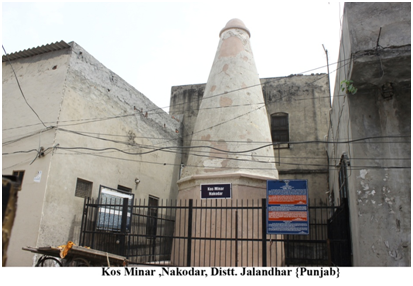This Kos Minar is located at Nakodar, tehsil Nakodar, District Jalandhar . In 1619 CE, emperor Jahangir ordered Baqir Khan, the Fauzdar of Multan, to erect a kos-minar (mile-stone) at every kos (3.20 km) on the old imperial route. Kos -minars are brick structures standing on square platform covered with plaster. Each minar soars from a tapering octagonal base which is separated from the upper circular portion by a moulding. During the Mughal time, the Kos Minars were important landmark of the imperial route and travel.